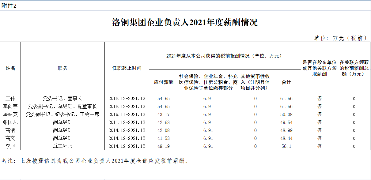 洛銅集團(tuán)公司企業(yè)負(fù)責(zé)人2021年度薪酬情況